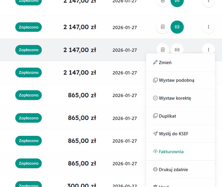 Po uzupełnieniu konfiguracji na liście faktur pojawi się nowa opcja : Fakturownia.