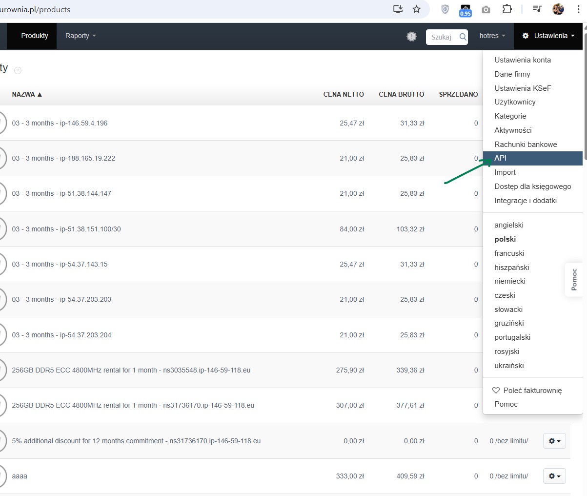 Po zalogowaniu z menu Ustawienia wybramy API.