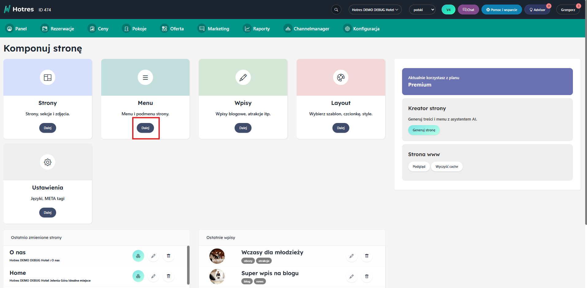 Przejdź do Marketing → Strona WWW, a następnie kliknij kafelek „Menu”, aby zarządzać pozycjami menu swojej strony.