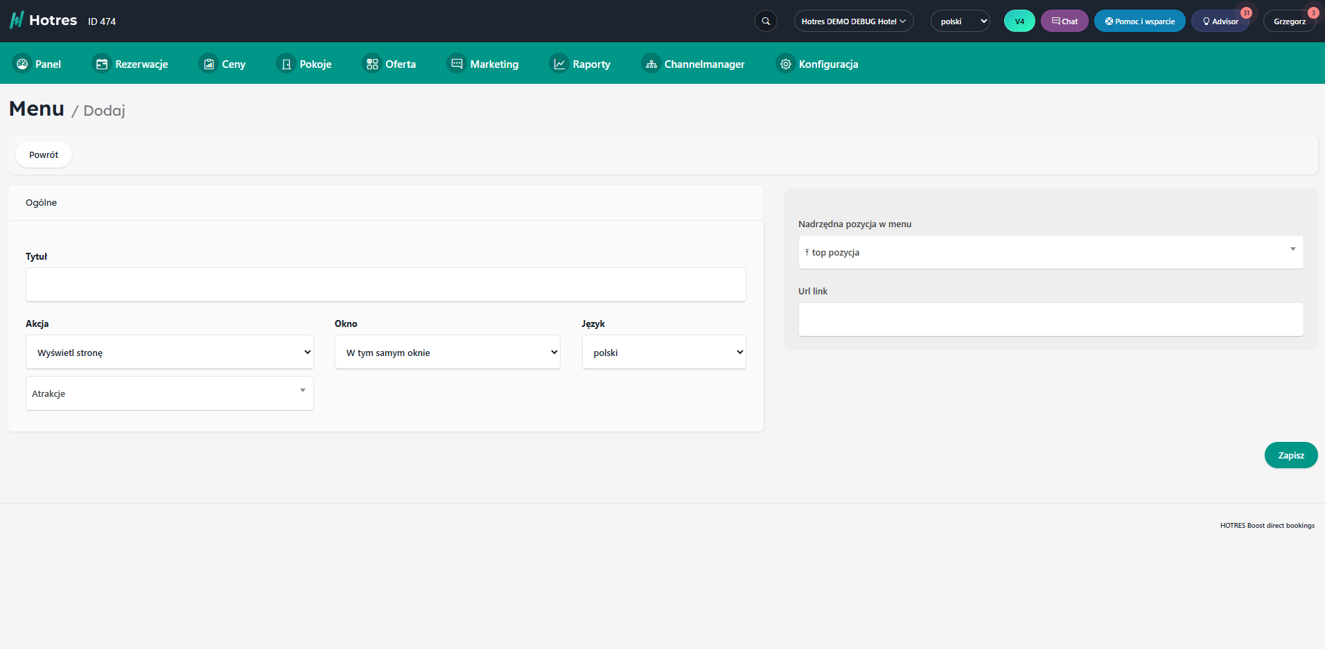 Po uzupełnieniu wszystkich pól kliknij przycisk „Zapisz”, aby dodać pozycję do menu.