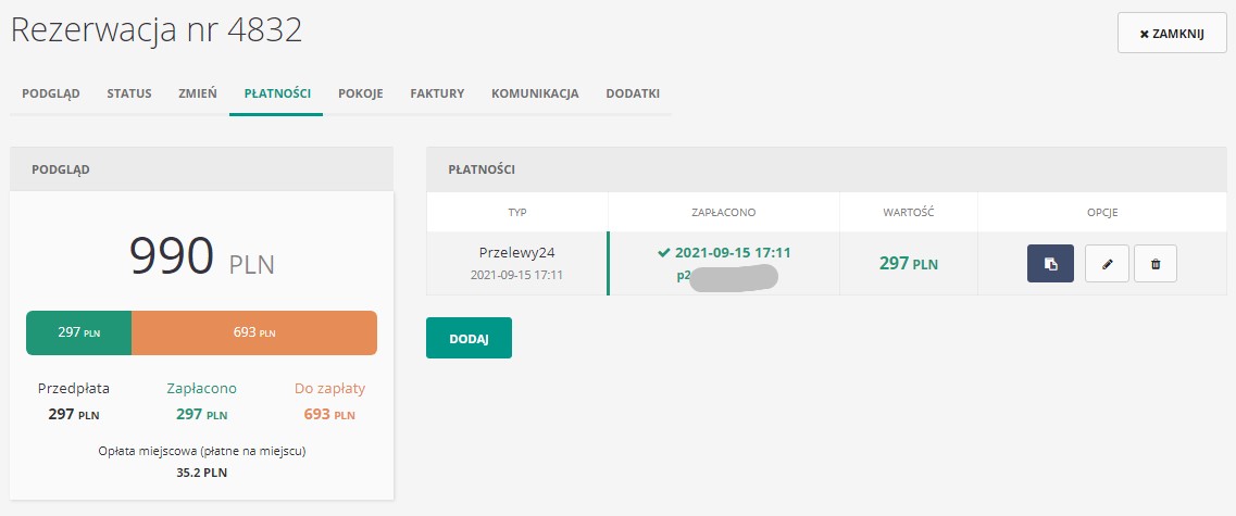płatności online, wówczas transakcje same się zapisują w rezerwacji z kwotą i datą. Jeśli jest to bon turystyczny, karta kredytowa czy zwykły przelew, wówczas wymaga to działania ze strony recepcji.