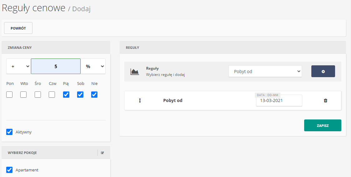 Po pierwsze należy wybrać jak ma się zmieniać cena, po drugie jaki warunek ma być spełniony: