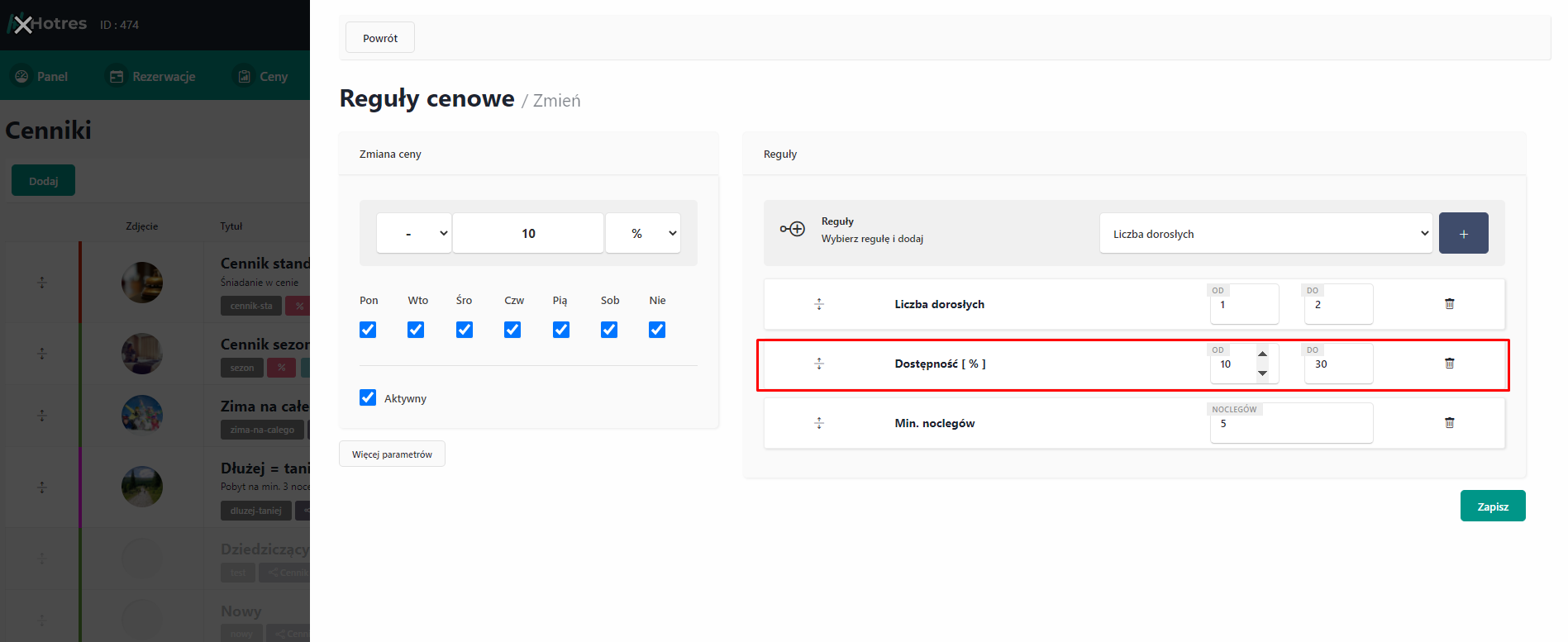 Do każdego z cenników możemy ustawić w systemie reguły cenowe. Jest to możliwość automatycznego zmodyfikowania ceny przy spełnieniu odpowiednich warunków, które można ustawić w tej zakładce według własnych preferencji.