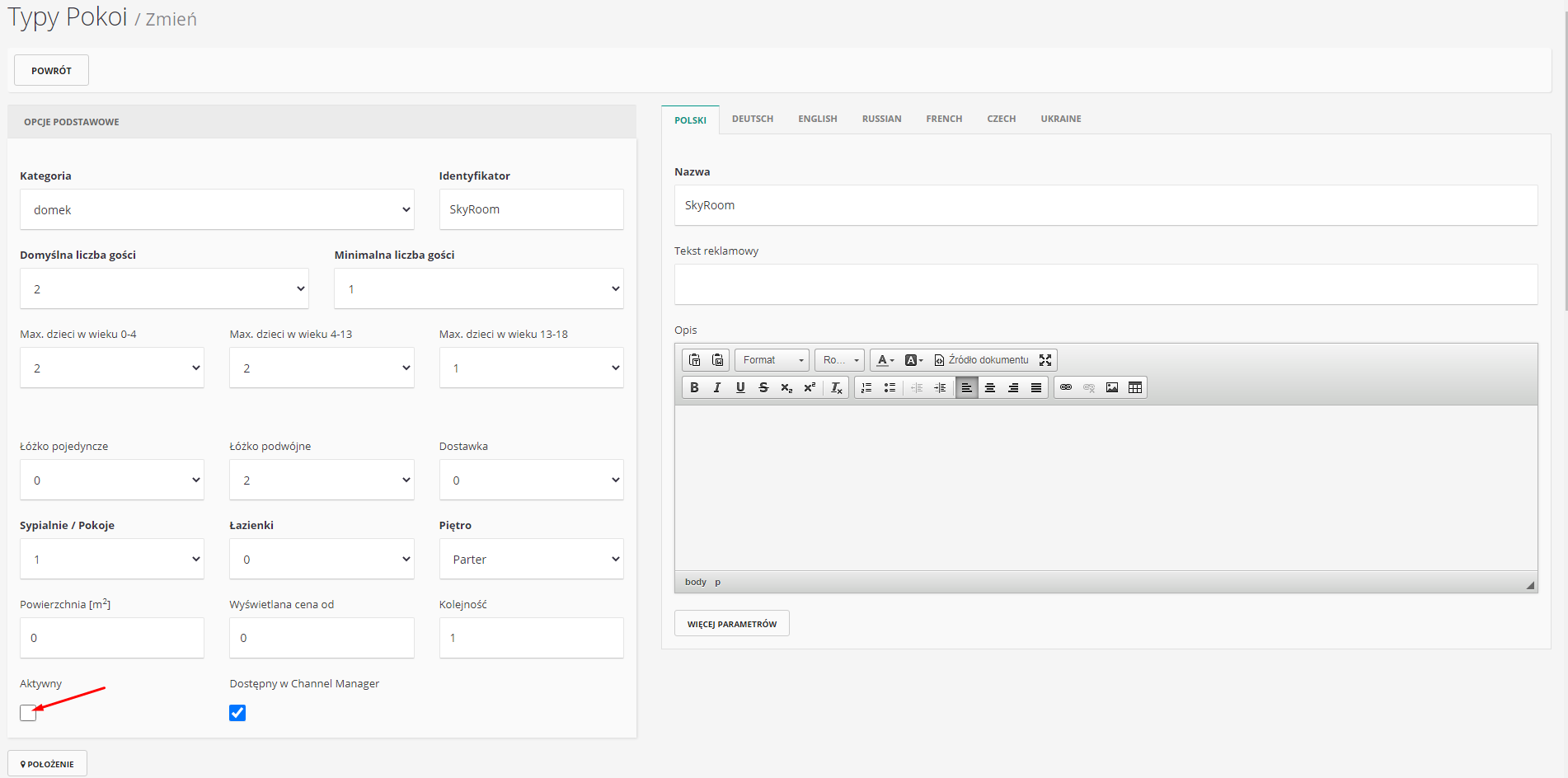 W zakładce Pokoje> Typy pokoi definiujemy standardy pokoi naszego obiektu. Uzupełniamy wszystkie pola, dodajemy nazwę, tłumaczenie nazwy pokoju, koniecznie identyfikator, ilość łożek i opis oraz wyposażenie: